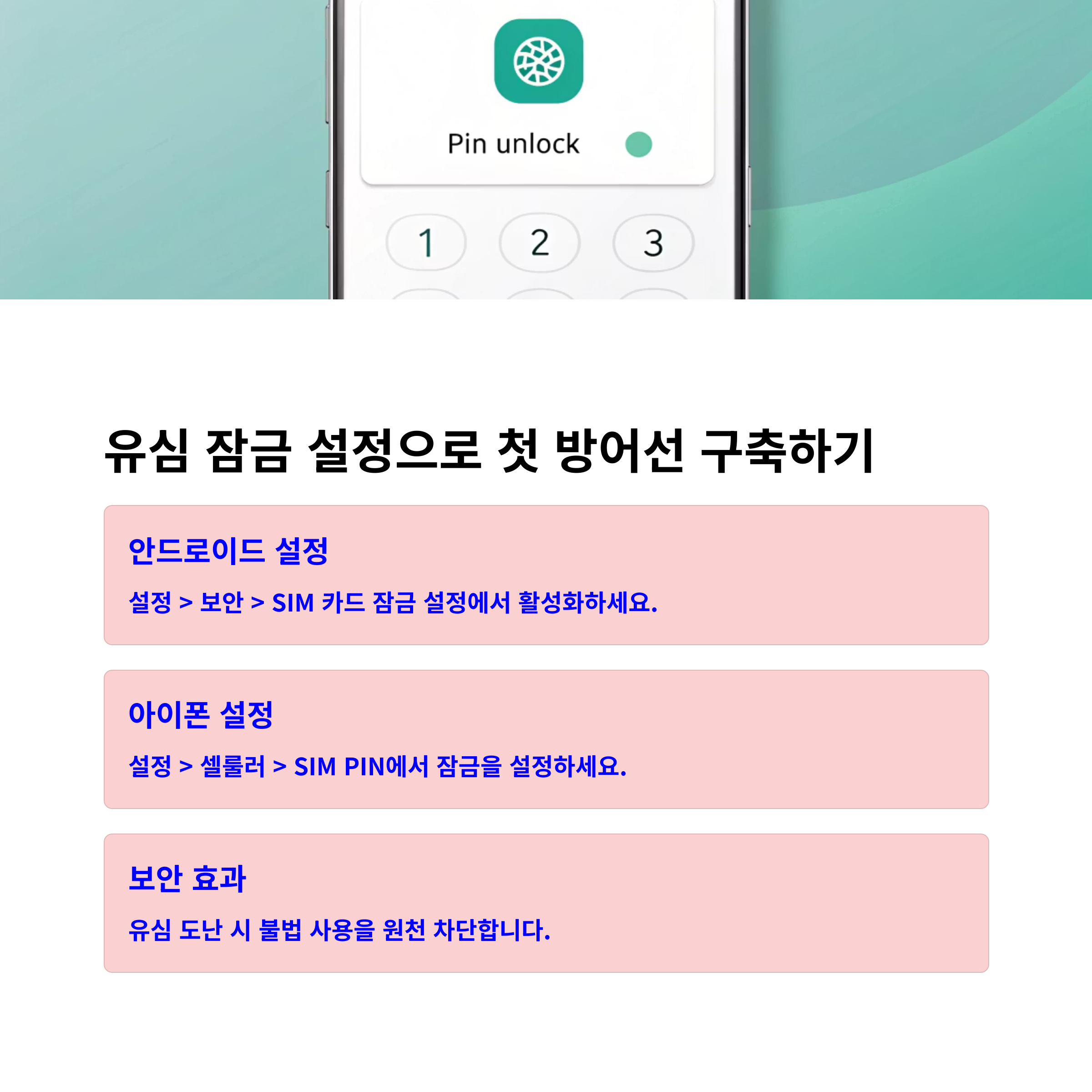 - 휴대폰을 재부팅하거나 다른 기기에 유심을 장착할 때, PIN 번호 입력을 요구해 불법 사용을 차단합니다.