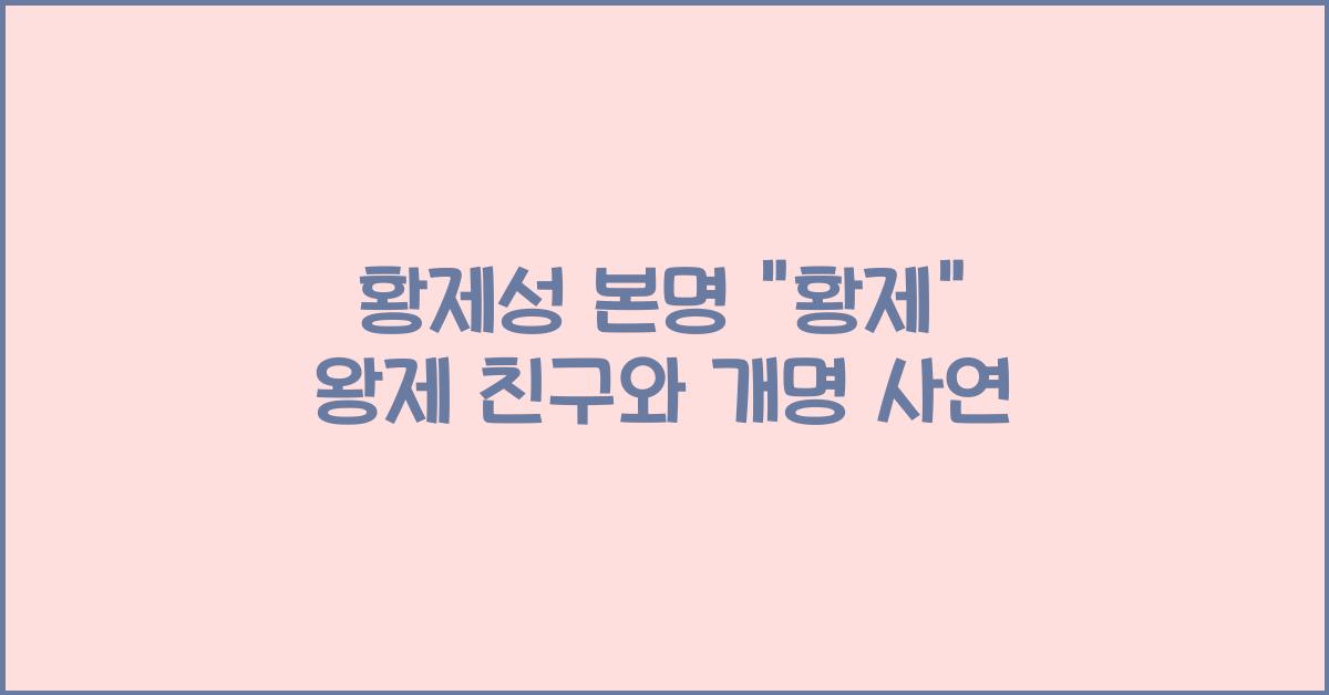 황제성의 본명은 ‘황제’이다. 이름에서부터 강한 존재감을 느낄 수 있다. 이렇게 독특한 이름을 가진 그가 어떻게 개명을 하게 되었을지 궁금하지 않은가? 그의 인생에 등장한 특별한 친구가 있다. 바로 ‘왕제’라는 이름을 가진 친구다. 왕제는 전학 와 황제와 함께 학교 생활을 하게 되면서 두 친구는 우정을 쌓아간다. 이름이 서로 유사한 만큼 그들의 관계는 더욱 특별해진다. 서로 이름을 부를 때마다 자연스럽게 웃음이 터지곤 했다고 한다.